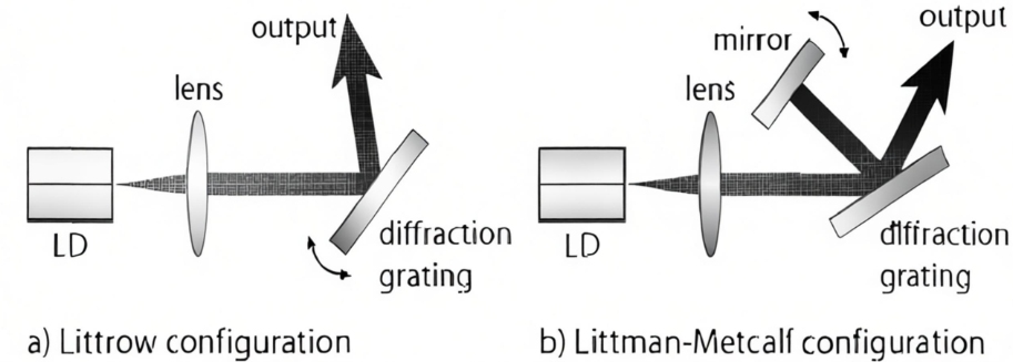 DFB və DBR kimi qısa boşluqlu əsas boşluq lazerləri boşluqdaxili fotonların qarşılıqlı əlaqə müddətini məhdudlaşdırır, bu da dərin xəttin sıxılmasını çətinləşdirir. Xətt genişliyini daha da sıxışdırmaq və səs-küyü basdırmaq üçün belə qısa boşluqlu əsas boşluq konfiqurasiyaları performansın optimallaşdırılması üçün tez-tez xarici boşluq strukturları ilə birləşdirilir. Ümumi xarici boşluq strukturlarına məkan xarici boşluqlar, lifli xarici boşluqlar və dalğa ötürücü xarici boşluqlar daxildir. Fiber-optik cihazların və dalğa ötürücü strukturların hazırlanmasından əvvəl xarici boşluqlar əsasən diskret optik komponentlərlə birləşən məkan optiklərindən ibarət idi. Bunlar arasında, ızgara əsaslı məkan xarici boşluqlu əks əlaqə strukturları, əsasən, bir lazer qazanma boşluğundan, birləşdirici linzalardan və difraksiya ızgarasından ibarət olan Littrow və Littman dizaynlarını qəbul edir. Rəy elementi kimi barmaqlıq dalğa uzunluğunun tənzimlənməsinə, rejimin seçilməsinə və xəttin eni sıxılmasına imkan verir.